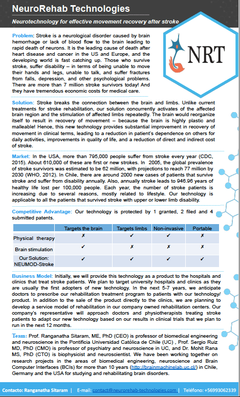 One Pager: NeuroRehab Technologies September 4, 2017 Ranganatha Sitaram i. Technology startup Leave a comment NeuroRehab_Onepager_English Share this: Click to share on X (Opens in new window) X Click to share on Facebook (Opens in new window) Facebook More Click to share on LinkedIn (Opens in new window) LinkedIn Click to share on Pinterest (Opens in new window) Pinterest Like Loading... Related
